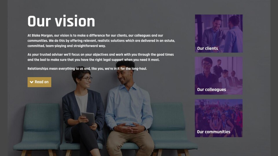 At Blake Morgan, our vision is to make a difference for our clients, our colleagues and our communities. We do this by offering relevant, realistic solutions which are delivered in an astute, committed, team-playing and straightforward way.